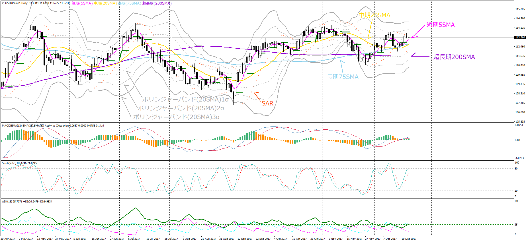 さらにサブウィンドウにストキャス(5-3-3)は参考、ADX(期間13)は勢いの判定用として表示しています。